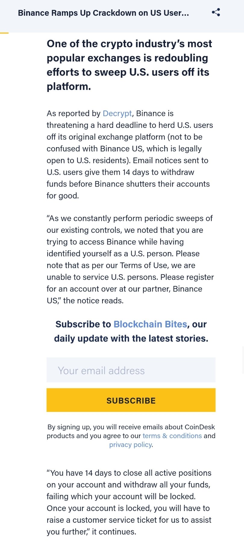 Binance Ramps Up Crackdown On Us Users Giving Them 14 Days To Withdraw Funds Coindesk